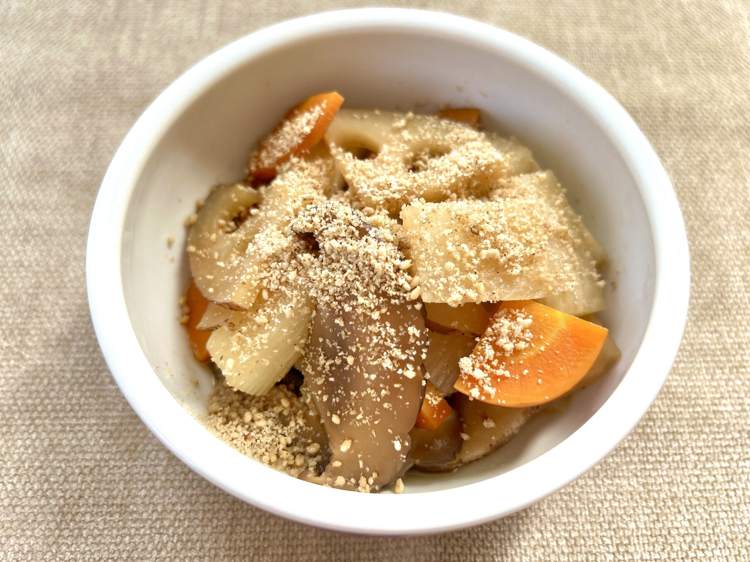 今回の煮物(蓮根・山芋・人参・干し椎茸)は乾燥を防ぎながら気血を補う組み合わせです。蓮根は肺を潤し、山芋は胃腸を整えて栄養の吸収を助けます。人参は血を養って肌や目に働きかけ、干し椎茸は気の巡りを整えて全体を調和します。